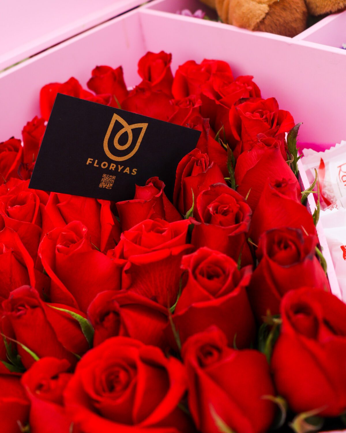Caja grande color rosas con corazón de rosas, chocolates, un peluche y dos orquídeas