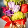 Arreglo cilíndrico de 150 rosos rojas con moño