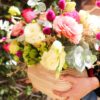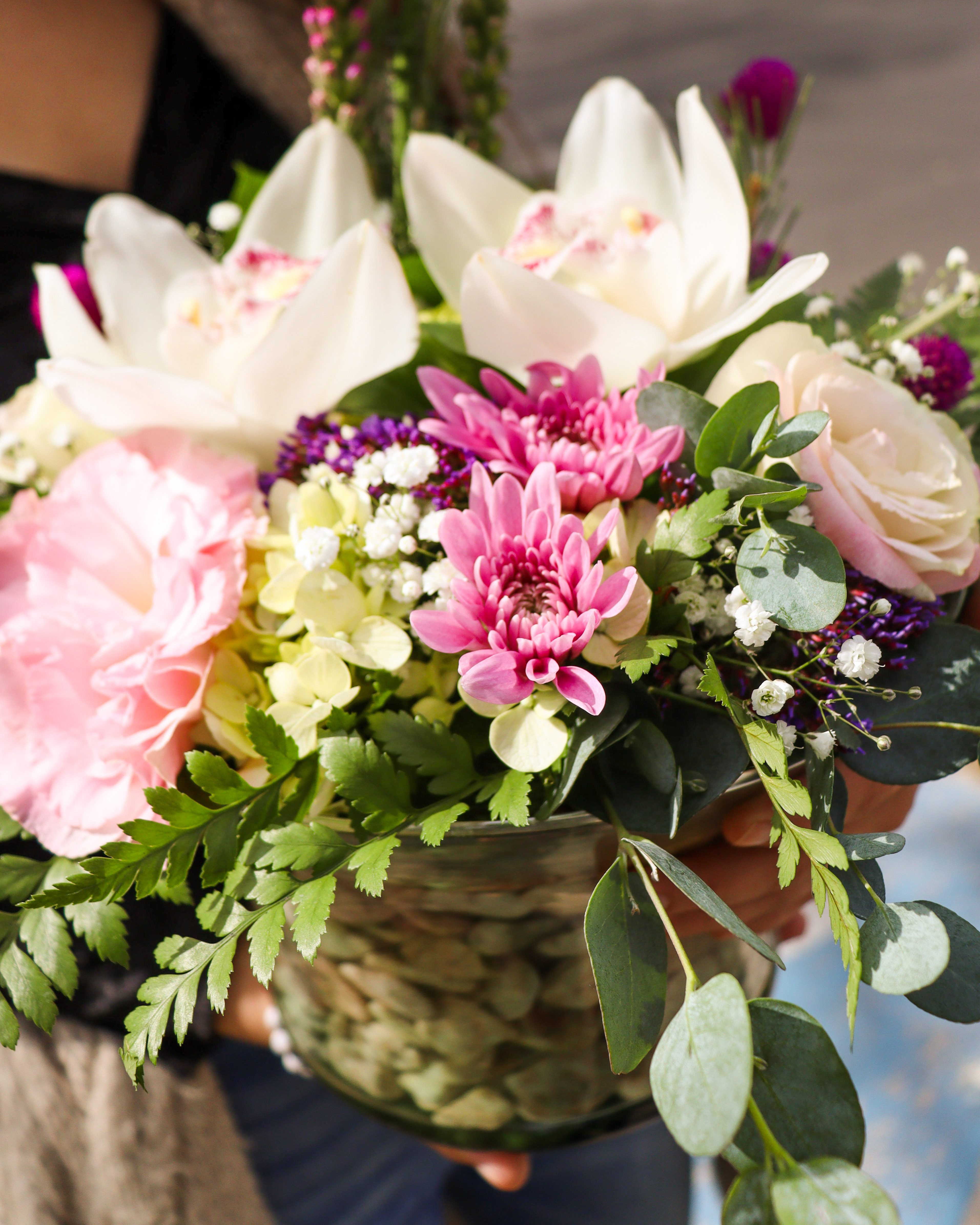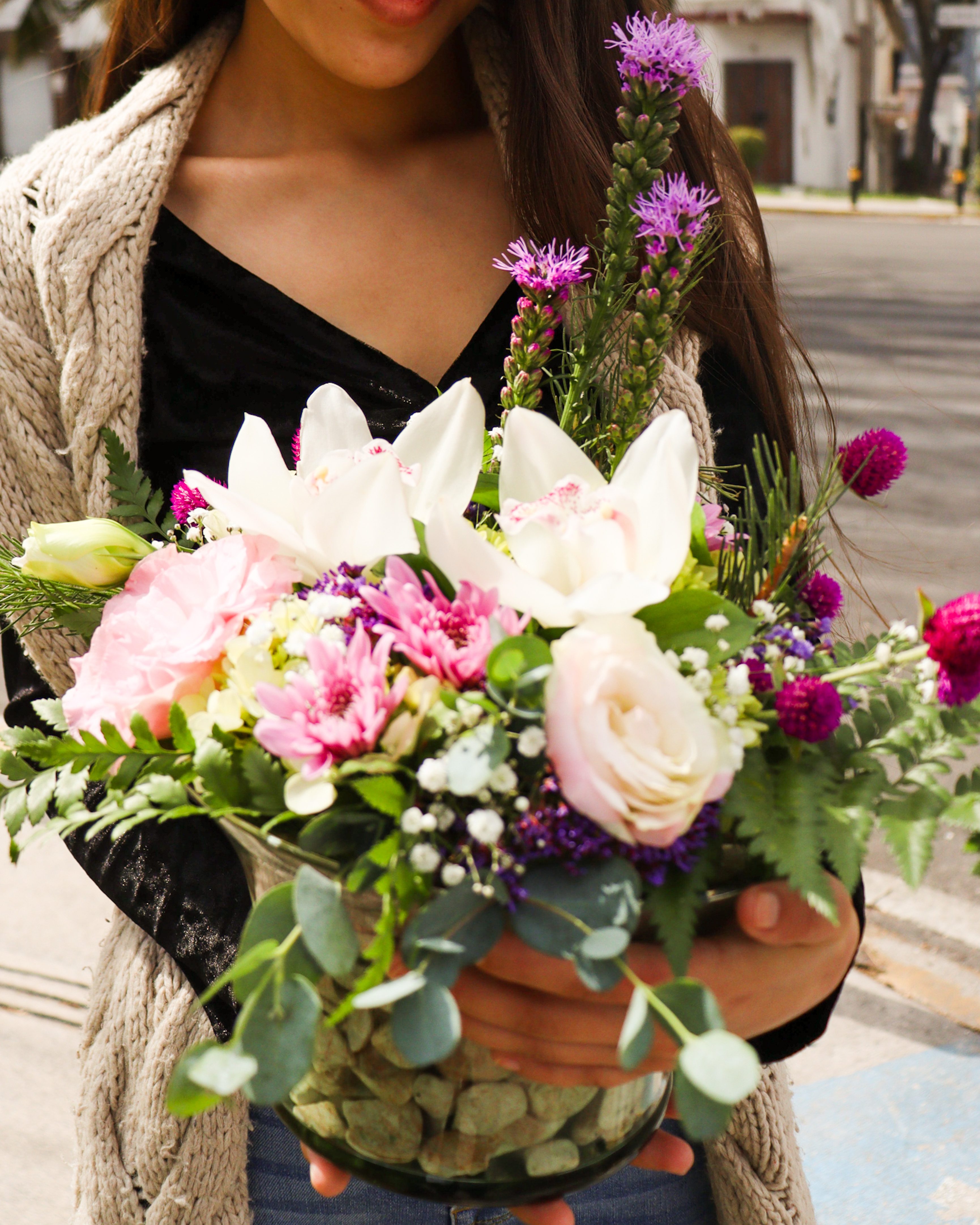 Florero pequeño de cristal con piedras. Rosas en color pastel y follaje