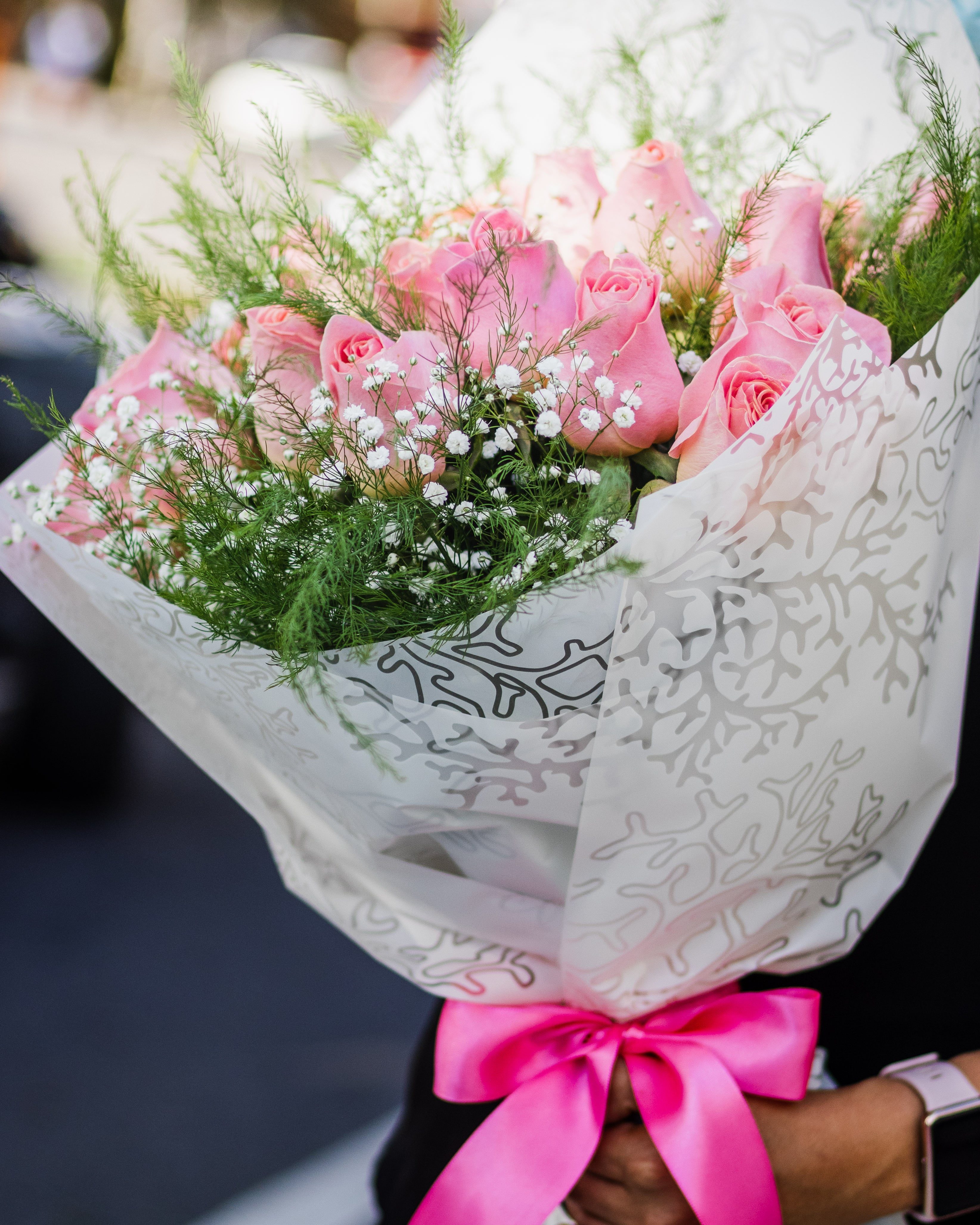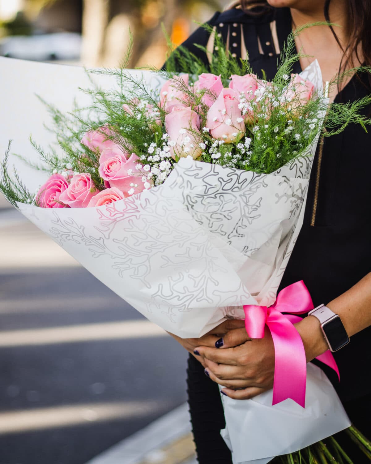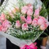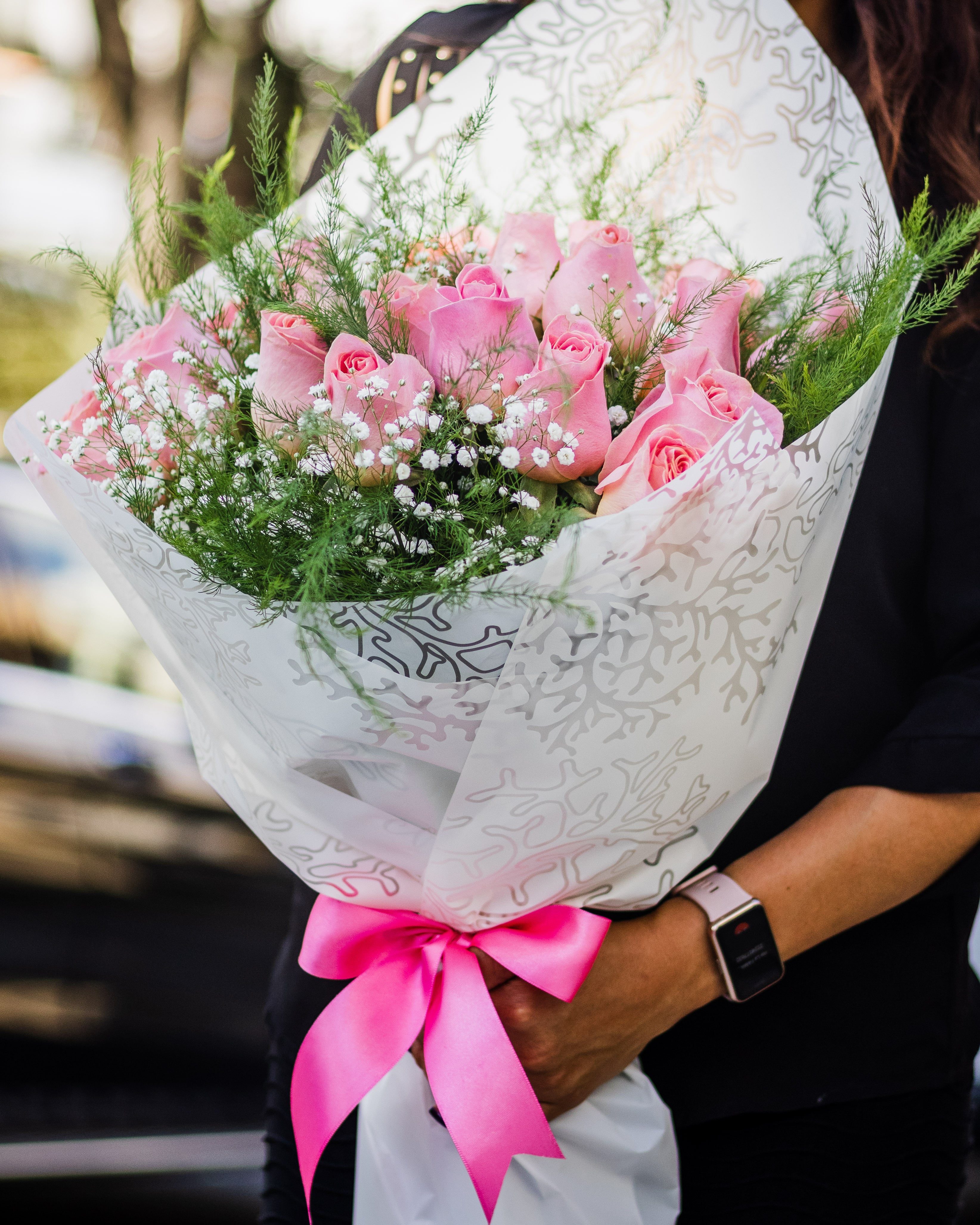 Ramo con 24 rosas rosas con flores baybi y follaje adecuado a la ocasión.