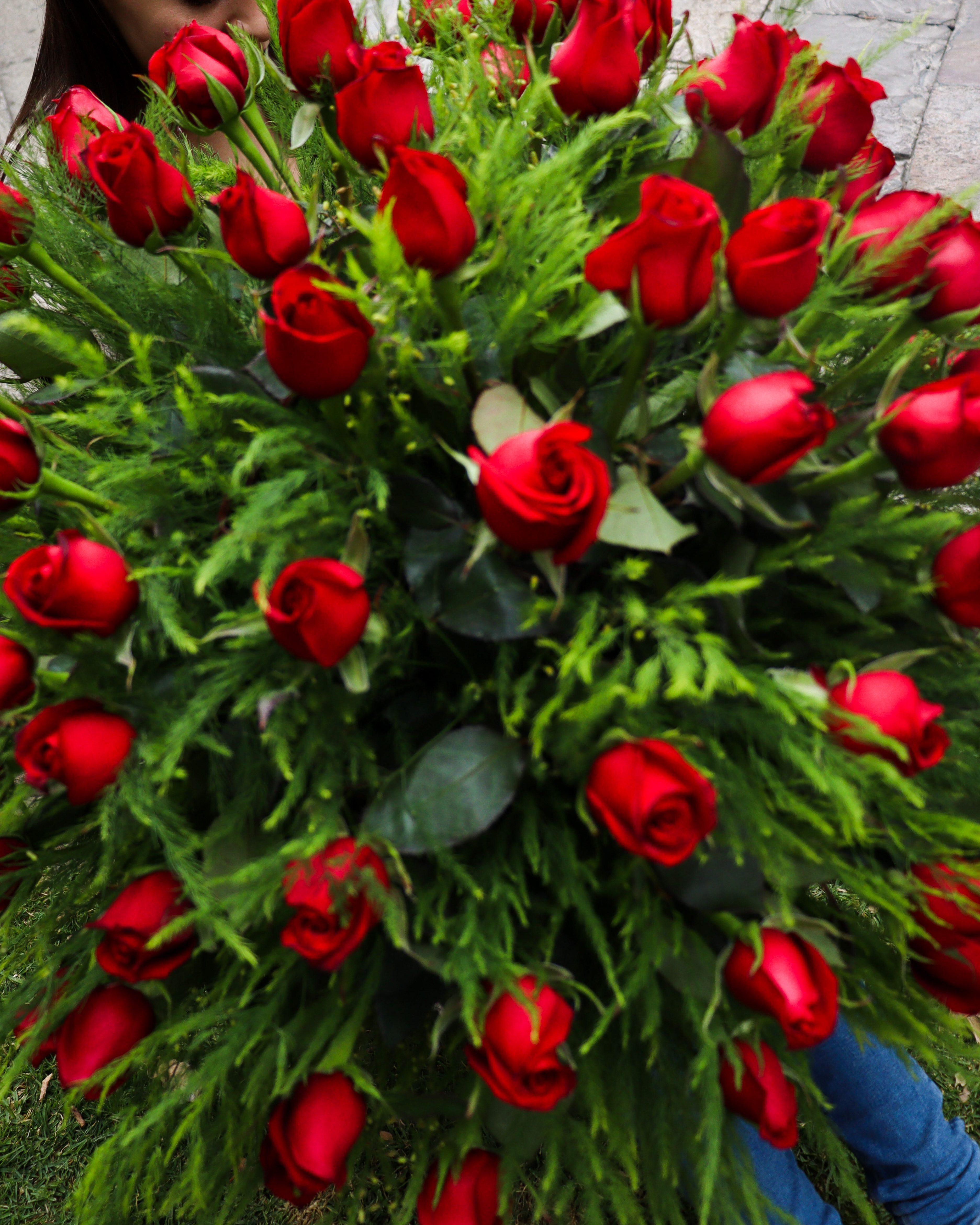 Canasta de 50 rosas rojas con follaje y 2 orquídeas